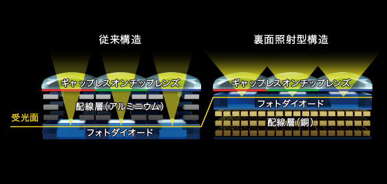 裏面照射型構造化により配線層をフォトダイオードの下に配置するとともに、回路プロセスを微細化することで、回路規模を大幅に拡大。さらに1画素あたりの読み出しを高速化し、配線層はAl(アルミニウム)配線から伝送速度の速いCu(銅)配線に変更。読み出しチャネル数を増やすことなく大容量のデータ伝送を可能にしました。約4240万画素の膨大な情報量を高速で読み出すことができるため、AFレスポンス性能の向上、全画素読み出しによる高解像度4K動画記録を実現しています。