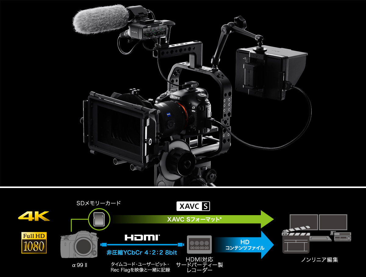 編集時に役立つタイムコードの設定、ユーザービットの入力機能を搭載。タイムコードを使用して複数の動画ファイルを正確に同期させるなど、高度な映像編集が可能。業務用カメラでは一般的なSDI信号と同等の取り扱いをHDMIで行えます。