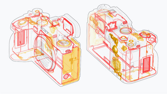 様々な静止画・動画プロからのフィードバックを反映し、防塵・防滴(*)に配慮し随所に様々な工夫を施しました。外装の合わせ目全周や電池蓋にシーリング構造を採用しているほか、ボタン周りのシリコンゴムパッキン、レンズロックボタン、マウント周りのクッション、ゴミや水滴の浸入経路となりえる箇所の構造の工夫により、屋外の厳しい撮影環境での使用にも耐えられるようになっています。さらには、α7S III同様に、EVFの光学レンズ群を密閉させる新構造を採用することで、二重ガラス構造と同じ効果を得ています。その結果、レンズ内側の曇りを防ぐことができ、防曇性がα9 II比で大幅に向上しています。また、メディア端子蓋は二重蓋構造のスライド機構とロックレバーの組み合わせにより、高い信頼性を実現しています。防塵・防滴仕様(*)のレンズ、フラッシュ、縦位置グリップ「VG-C4EM(別売)」と組み合わせることにより、システムとしての高い防塵・防滴性能を発揮します。