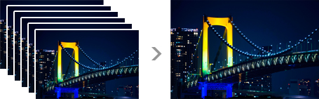 シーンセレクションの「手持ち夜景」モードは、高速連写した6枚の画像を1枚に重ね合せるので、ノイズを増やさずに高感度で撮影できます。夜景を撮るときはもちろん、落ち着いた照明のレストランなどで写真を撮りたいときも、フラッシュや三脚を使わずに、ブレを抑えてキレイな写真を手持ちで撮影できます。