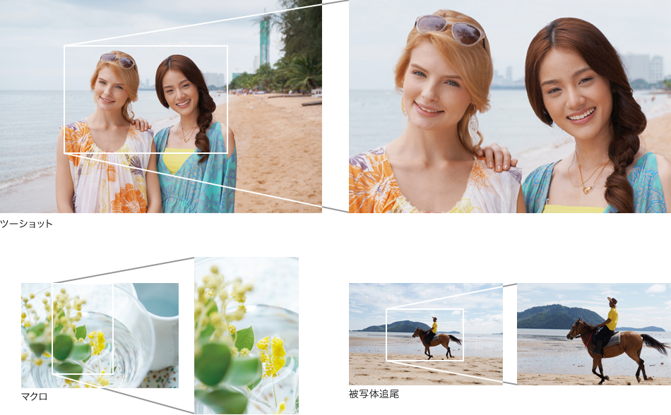 ※ 切り出された画像は「全画素超解像技術」によりオリジナル画像と同じ解像感を保ちます。また、オリジナル画像も保存されます。画質モードがRAW、RAW+JPEG時、連写撮影時、重ね合わせ処理設定時、デジタルズーム時、マニュアルフォーカス時は使用できません