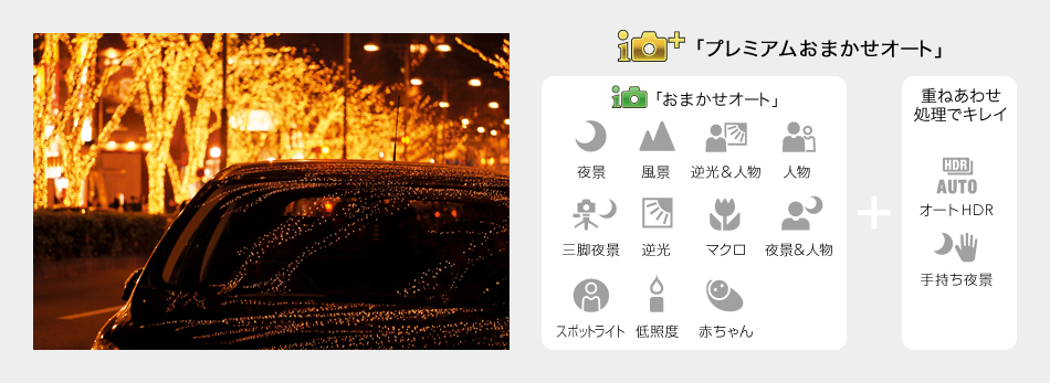 どんなときも失敗せずに、素敵な写真を残したいから、カメラがシーンに合わせて自動で設定する「おまかせオート」に加え、最適な機能を呼びだして撮影できる「プレミアムおまかせオート」を搭載。逆光のときは「オートHDR(ハイダイナミックレンジ)」機能、夜景のときは「手持ち夜景」モードなど、高度な撮影機能を手軽に使えるので、シャッターを切るだけで、カメラまかせでキレイな写真を残せます。