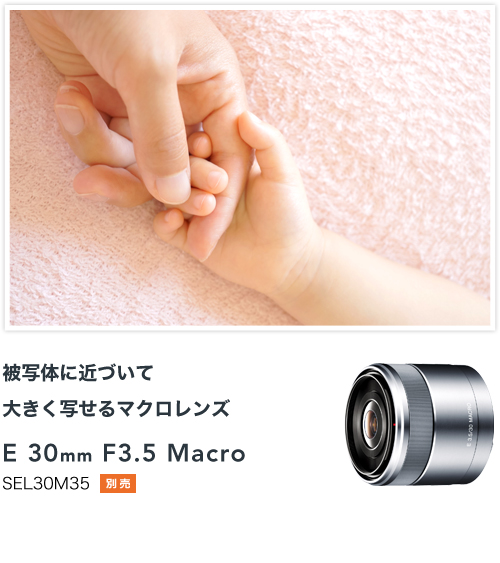 キットレンズのE PZ 16-50mm F3.5-5.6 OSS(*)、E 55-210mm F4.5-6.3 OSS(*)をはじめ、超広角ズームレンズのE 10-18mm F4 OSS、単焦点レンズのE 35mm F1.8 OSSなどには、光学式手ブレ補正機能を内蔵。さまざまなシーンで気になる手ブレをしっかり抑えて、クリアな画質でキレイに残せます。