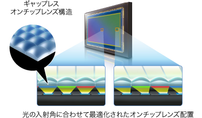APS-Cサイズの大型イメージセンサーに、最先端の技術を搭載して高画質化。レンズから入射する光を最大限にイメージセンサーに取り込むため、隣接する画素間のギャップを最小限に抑え、集光効率を飛躍的に高めました。さらに、オンチップレンズの位置を光の入射角に合わせて最適化し、入射角が厳しくなるイメージセンサー周縁部まで高画質にすることで、APS-Cサイズの大型イメージセンサーの中でもトップクラスの画質を実現しています。