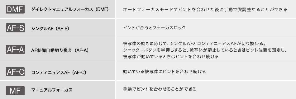 手動でピントを合わせるマニュアルフォーカスや、オートフォーカスでピントを合わせた後に手動でピントを微調整できる「ダイレクトマニュアルフォーカス(DMF)」機能を搭載。また、オートフォーカスモードは、「シングルAF(AF-S)」と動いている被写体にピントを合わせ続ける「コンティニュアスAF(AF-C)」に加え、AF-SとAF-Cをカメラが自動で判断して切り替える「AF-A」モードも搭載しました。