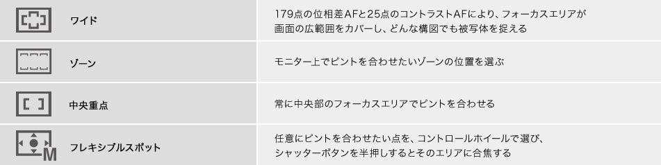 179点の位相差AFと25点のコントラストAFにより、フォーカスエリアが画面の広範囲をカバーし、どんな構図でも被写体をとらえる「ワイド」。 画面中央のみでピントを合わせる「中央重点」。 ユーザーが任意にピントを合わせる位置を指定できる「フレキシブルスポット」。さらに、25点のコントラストAF枠から3×3のエリアを自由に設定できる「ゾーン」。4種類のフォーカスエリアから、被写体や構図にあわせて選択できます。