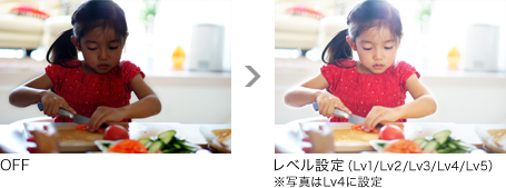 逆光などの明暗差が大きいときに、撮影した画像の各領域を分析し、黒つぶれや白とびを抑えて自然な階調表現に自動補正する「Dレンジオプティマイザー」。連続撮影にも対応し、人物撮影やスナップはもちろん、スポーツシーンにまで幅広く活用できます。設定は、画面全体を自動で最適化する「オート」と、補正効果を5段階で選べる「レベル設定」から選べます。