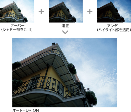 見たままの自然な印象を再現する「オートHDR(ハイダイナミックレンジ)」機能は、1回のレリーズで露出の異なる3枚の画像を連続露光。カメラ内で最適に自動合成を行い、1枚のJPEG画像を生成します。明るい領域をより鮮明に、暗い領域の階調もしっかりと残した描写が可能です。
