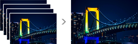 シーンセレクションの「手持ち夜景」モードを選択すれば、高速連写した4枚の画像を1枚に重ね合わせることで、高感度での撮影もノイズを抑えたクリアな画質を実現。三脚なしでブレの少ない夜景を手持ち撮影できます。