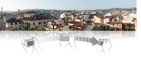 シャッターボタンを押してカメラをひと振りするだけで、パノラマ写真を撮影できます。カメラが自動的に連続撮影した画像を、カメラ内で1枚の画像に自動で合成します。これまで画面に収まりきらなかった広大な風景や構造物を、かんたんにパノラマ写真にできます。