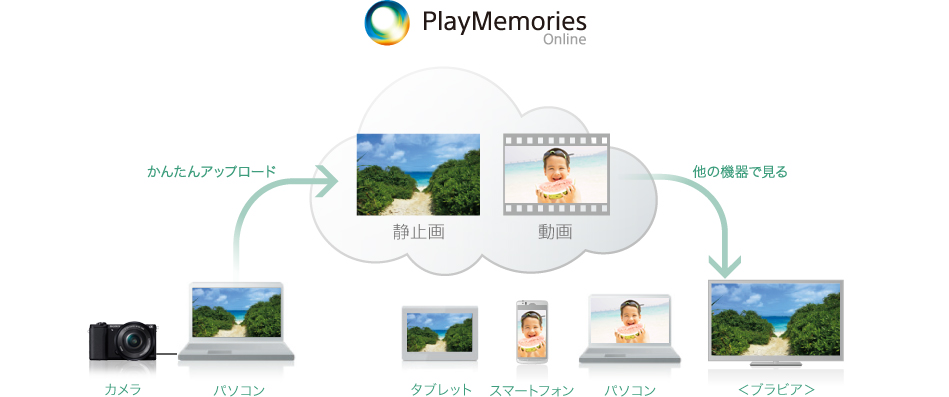 写真や動画をアップロードして、さまざまな機器で楽しむことができるクラウドサービスPlayMemories Online。オールシンク機能をオンにすれば、パソコンやスマートフォンに散らばった写真を自動的にクラウドへアップロード(*)してくれます。もちろん、クラウドに保存された写真や動画を友人や家族と共有できます。