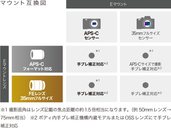 「ソニーEマウント」α6000ならAPS-Cフォーマット対応レンズはもちろん、35mmフルサイズ対応のレンズもアダプター無しでそのまま使うことができます。