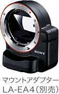 ソニー独自開発の「トランスルーセントミラー・テクノロジー」を搭載したマウントアダプターLA-EA4(別売)を使えば、すべてのAマウントレンズ (*)を装着可能。さらに静止画・動画を問わず高速・高精度なTTL位相差検出方式AFが働き、決定的な瞬間を逃さずとらえられます。広角から望遠まで豊富なαレンズ(Aマウントレンズ)で、より多彩な表現を楽しめます。