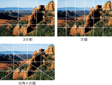 画面上にグリッドラインを表示できるので、水平や垂直の傾きを補正しながら、緻(ち)密なフレーミングが可能です。グリッドラインの表示は「3分割」「方眼」「対角+方眼」の3種類から選べます。