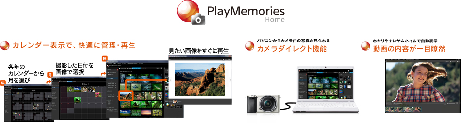 付属ソフトPlayMemories Homeを使えば、写真だけでなく動画もカレンダー表示でかんたんに整理・検索・再生が行えます。パソコンをつなぐだけで、カメラ内の映像を取りこまなくても見ることができます。さらに、パソコンに取りこんで編集したり、DVDを作成したり、便利な機能を使って楽しくかんたんに管理、活用できます。