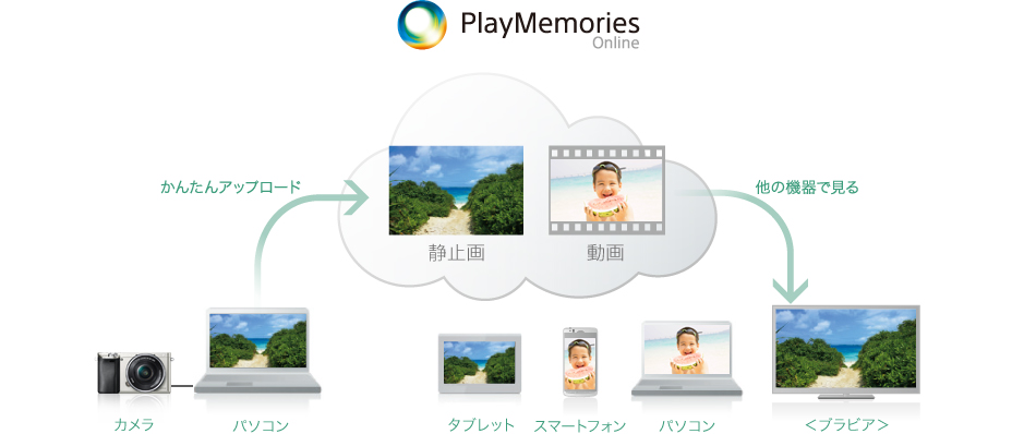 写真や動画をアップロードして、さまざまな機器で楽しむことができるクラウドサービスPlayMemories Online。オールシンク機能をオンにすれば、パソコンやスマートフォンに散らばった写真を自動的にクラウドへアップロード(*)してくれます。もちろん、クラウドに保存された写真や動画を友人や家族と共有できます。