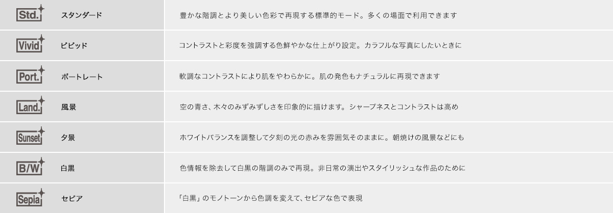 写真の仕上がりをコントロールできる「クリエイティブスタイル」機能を搭載。「スタンダード」「ビビッド」「ポートレート」「風景」「夕景」「白黒」「セピア」の全7種類のモードから選択でき、撮影シーンやイメージに合わせてカメラが自動で最適な画像処理と調整を行います。また、動画撮影時にも、「クリエイティブスタイル」機能を設定できます。