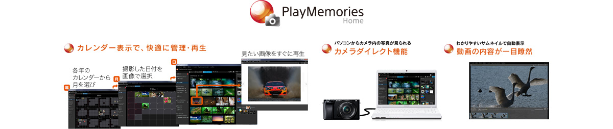 PCソフトウェアPlayMemories Homeを使えば、写真だけでなく動画もカレンダー表示でかんたんに整理・検索・再生が行えます。パソコンをつなぐだけで、カメラ内の映像を取りこまなくても見ることも可能です。さらに、パソコンに取りこんで編集したり、DVDを作成したり、便利な機能を使って楽しくかんたんに管理、活用できます。