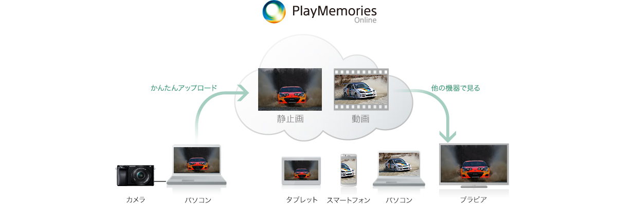 写真や動画をアップロードして、さまざま機器で楽しむことができるクラウドサービスPlayMemories Online。オールシンク機能をオンにすれば、パソコンやスマートフォンに散らばった写真を自動的にクラウドへアップロード(*)してくれます。もちろん、クラウドに保存された写真や動画を友人や家族と共有できます。