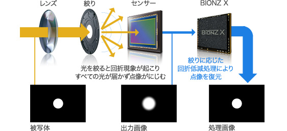 センサーの画素数が増えるにつれて、深い被写界深度での撮影を必要とする風景撮影や集合写真などで課題となるのが回折現象です。画素サイズが小さくなるほど、また絞りを絞るほど顕著に現れるこの症状を低減する回折低減処理を搭載。絞り値に応じたフィルター処理を適用し、パンフォーカス撮影においても高い解像感を実現します。