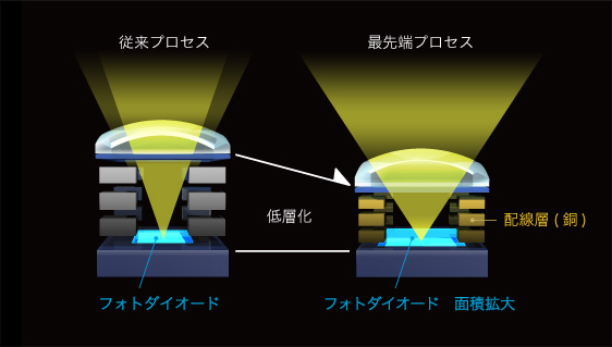 銅配線の採用と回路プロセスの微細化により、画素の配線層を限界まで低層化する「高集光プロセス技術」と、光を取り込むフォトダイオードの受光面積を拡大する「ワイドフォトダイオード設計」が進化。これにより集光効率を飛躍的に高めることができ、画素単位のS/N比が大幅に向上。より高感度でノイズの少ない高画質を実現しています。
