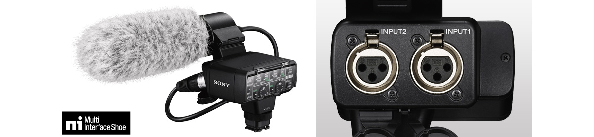 外付けマイクが装着可能なマイク端子を装備。さらに、プロ用オーディオ機器の標準形式XLR端子に対応。別売のXLRアダプターキット(XLR-K2M)を接続すれば、高性能マイクやミキサーなどXLR端子機器からのライン入力が可能です。また、2chの入力をそれぞれ独立して設定でき、より本格的な動画撮影を実現します。