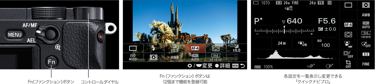 即時性やカスタマイズ性を追求したユーザーインターフェースを採用。Fn(ファンクション)ボタンを押すと撮影画面上に任意の機能を12個まで表示でき、設定したい機能にすばやくアクセスできます。また、α7シリーズなどに採用されている「クイックナビプロ」も搭載。カメラのパラメーターを一覧表示でき、コントロールダイヤルですばやく設定変更が可能。レスポンスも向上し、軽快な操作感を実現しています。