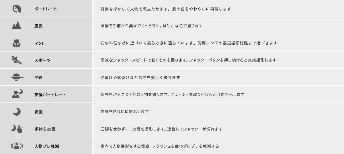 撮影シーンに応じてモードを選択するだけで、カメラが自動的に絞りやシャッタースピードはもちろん、ホワイトバランスや画質まで、シーンに最適になるようコントロールします。「ポートレート」「風景」「マクロ」「スポーツ」「夕景」「夜景ポートレート」「夜景」「手持ち夜景」「人物ブレ軽減」モードの9種類から選択できます。