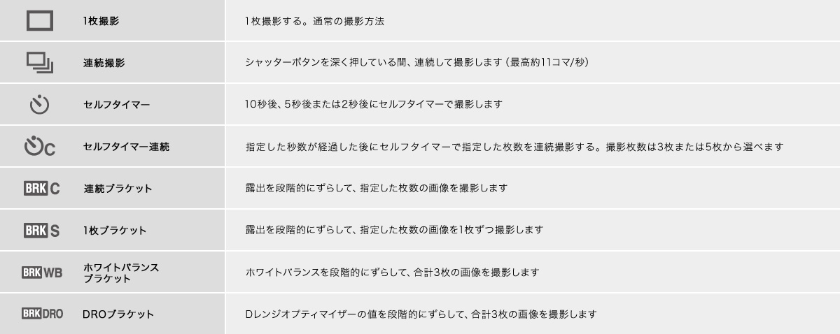 最高約11コマ/秒の「Hi+」から最高約3コマ/秒の「Lo」まで4段階で選べる連続撮影のほか、多彩なブラケット機能をドライブモードに搭載。「ホワイトバランスブラケット」やDレンジオプティマイザーの値を段階的にずらす「DROブラケット」、「連続ブラケット」「1枚ブラケット」では、0.3EV、0.5EV、0.7EV、1.0EV、2.0EV、3.0EVステップで3枚または5枚のブラケットに加え、0.3EV、0.5EV、0.7EV、1.0EVステップで9枚のブラケット撮影も可能です。ハイダイナミックレンジ(HDR)合成のような、デジタルならではのクリエイティブな表現に活用できます。もちろん「セルフタイマー」にも対応しています。