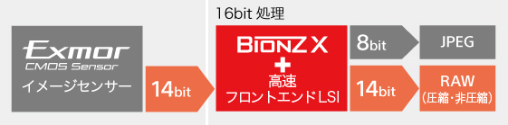 イメージセンサー内でAD変換された14bitのデジタル信号を、画像処理エンジン「BIONZ X」のシステム内で一度16bit処理してから、RAW画像に14bit出力することで、より豊かな階調表現と高画質を実現します。
