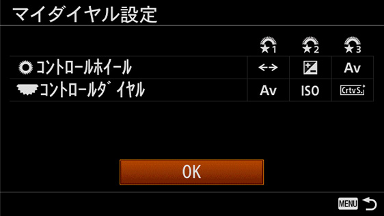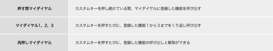 よく使う機能をコントロールダイヤルおよびコントロールホイールに割り当てられます。押す間マイダイヤル、再押しマイダイヤル、再押しマイダイヤル(連続)と組み合わせで使うことができ、登録した機能をスピーディーに呼び出せます。