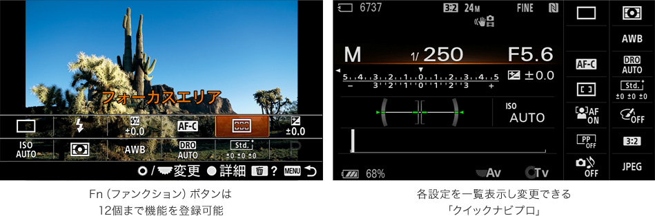即時性やカスタマイズ性を追求したユーザーインターフェースを採用。Fn(ファンクション)ボタンを押すと撮影画面上に任意の機能を12個まで表示でき、設定したい機能に素早くアクセスできます。また、α7シリーズなどに採用されている「クイックナビプロ」も搭載。カメラのパラメーターを一覧表示でき、コントロールダイヤルでスピーディーに設定変更が可能。レスポンスも向上し、軽快な操作感を実現しています。