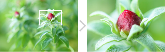 「ピント拡大」機能でピントを合わせたいエリアを選択し、ファインダーまたは液晶モニター上で拡大表示させた状態からオートフォーカスでピントを合わせることが可能に。拡大表示中は、フレキシブルスポットより狭いエリアでピントを合わせられるため、マクロ撮影時などのピントによりシビアなシーンに有効です。また、オートフォーカスでピントが合った状態から拡大表示することもでき、ピント位置の確認やピントの合わせ直しもできます。
