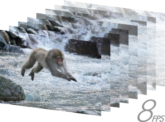 電子ビューファインダー/液晶モニターにほぼタイムラグなしで映像を表示しながら連写できる、最高約8コマ/秒(*)の高速ライブビュー連写が可能。従来の撮影画像を表示しながらの連写に比べ、フレーミングがしやすくなりました。連写速度は被写体に合わせて選択可能です。