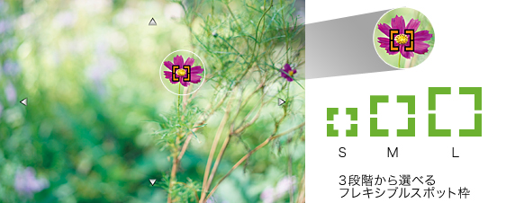 画面上の任意の場所を選択してピント合わせができるフレキシブルスポットのスポット枠サイズを3段階から選択可能。スポット枠が狙った被写体よりも大きくピントが定まらない場面でも、スポット枠を小さくし、より厳密なピント合わせができます。