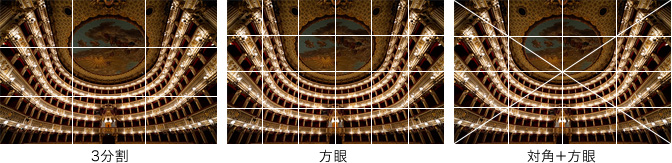 画面上にグリッドラインを表示できるので、水平や垂直の傾きを補正しながら、緻密(ちみつ)なフレーミングが可能です。グリッドラインの表示は「3分割」「方眼」「対角+方眼」の3種類から選べます。