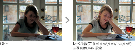 逆光などで明暗差が大きいときに、撮影した画像の各領域を分析して、自然な階調表現に自動補正します。高速画像処理エンジンにより、連続撮影にも対応。人物のスナップ設定からスポーツシーンまで幅広く活用できます。設定は、画像の領域ごとに適正に補正し、黒つぶれと白とびの両方を抑える「オート」と、補正効果を5段階で選べる「レベル設定」があります。
