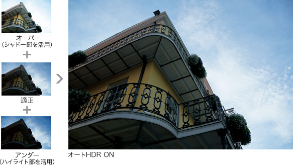 見たままの自然な印象を再現する「オートHDR」機能は、1回のレリーズで露出の異なる3枚の画像を連続露光。カメラ内で最適に自動合成を行い、1枚のJPEG画像を生成します。明るい領域をより鮮明に、暗い領域の階調もしっかりと残した描写が可能です。設定は「オート」のほか、露出差レベルを1.0-6.0EV間で1.0EVごとに設定できる「露出差レベル設定」から選択できます。