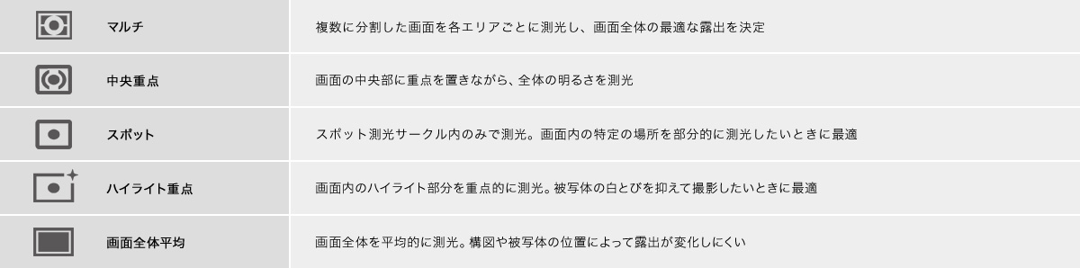 CMOSセンサーがとらえた画像を1200分割し、被写体の色や光の状況を細かく分析して高精度な測光を行います。測光モードは、各エリアの測光データをもとに適正露出を算出し、失敗の少ない露出制御を行える「マルチ測光」。知識や経験が生かせる「中央重点測光」、狙った部分だけを測光する「スポット測光」に加え、「ハイライト重点測光」と「画面全体平均測光」を新たに搭載。「ハイライト重点測光」は画面内の最も明るい領域を自動で検出し、そこに重点を置いて測光することで、ハイライトの白とびを防いで撮影できます。主要被写体がスポットライトを浴びる舞台撮影などで有効です。また、「画面全体平均測光」を選択すると、画面全体の明るさを平均して測光します。構図変化に対してAEが安定しやすくなり、AE動作の予測が容易になります。