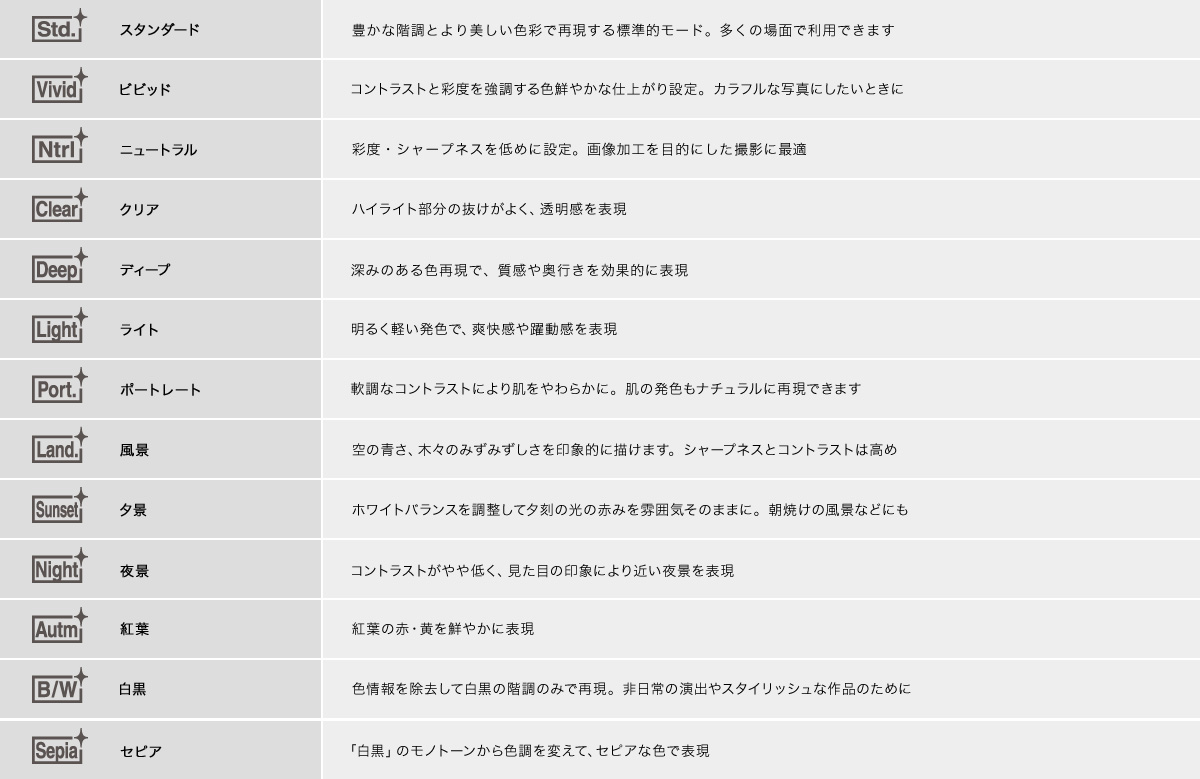 写真の仕上がりをコントロールできる「クリエイティブスタイル」機能を搭載。「スタンダード」「ビビッド」「ポートレート」「風景」「夕景」「白黒」「ニュートラル」「クリア」「ディープ」「ライト」「夜景」「紅葉」「セピア」の全13種類のモードから選択でき、撮影シーンやイメージに合わせてカメラが自動で最適な画像処理と調整を行います。さらに、コントラスト、彩度、シャープネスは、自分の好みで細かく調節できます。また、動画撮影時にも、「クリエイティブスタイル」機能を設定できます。