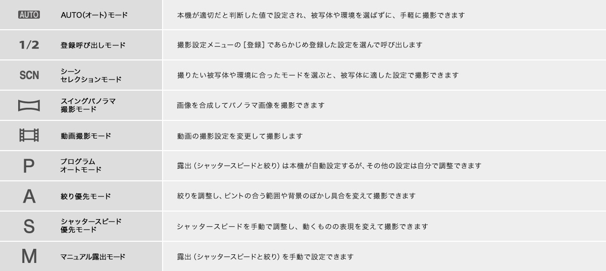 フルオートのかんたん撮影機能のほか、本格的にクリエイティブな意図を反映できる露出モードを搭載。シャッタースピードと絞り値を自動設定する「プログラムオート(P)」をはじめ、「絞り優先(A)」「シャッタースピード優先(S)」「マニュアル(M)」モードのほか、好みの設定を登録できる「MR(メモリーリコール)モード」を搭載。モードダイヤルから自分好みの設定をすばやく呼びだせます。