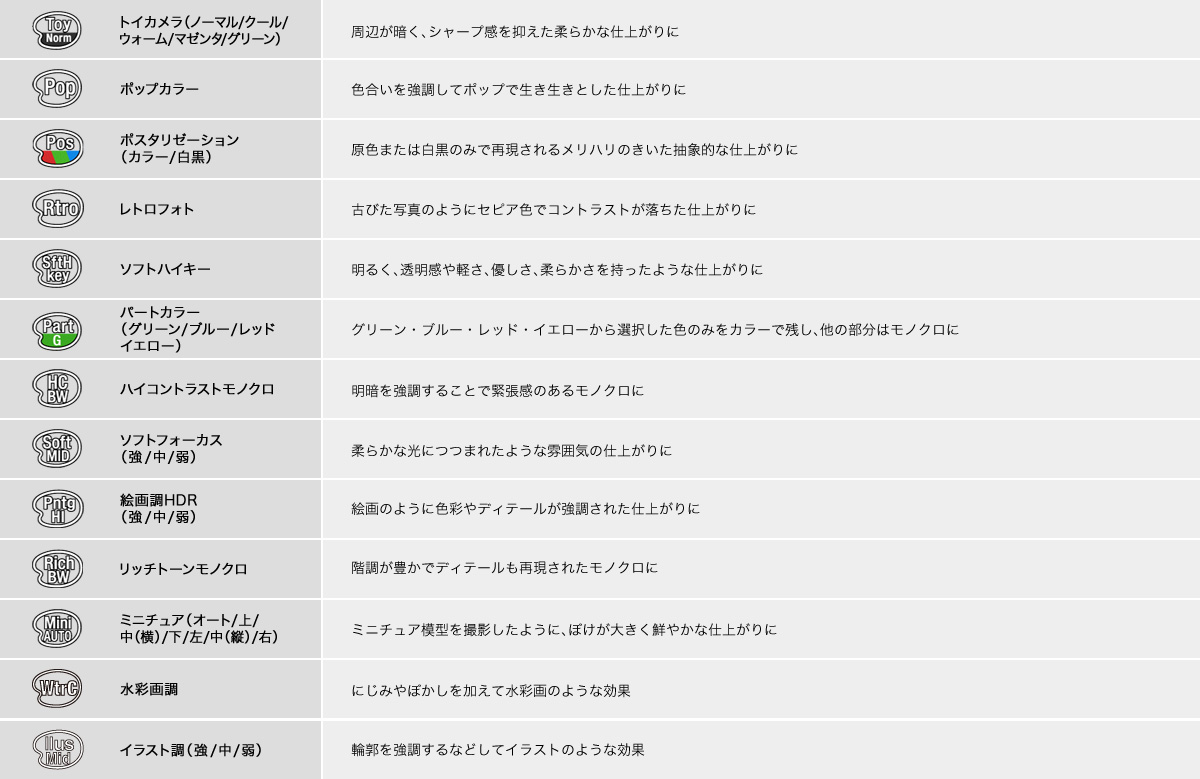 ※ 一部のエフェクトはライブビュー画および動画撮影時に反映されません
