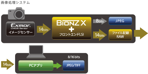 イメージセンサー内でAD変換された14bitのデジタル信号を、新開発のフロントエンドLSIと「BIONZ X」のシステム内で一度16bit処理してから、RAW画像に14bit出力することで、より豊かな階調表現と高画質を実現します。