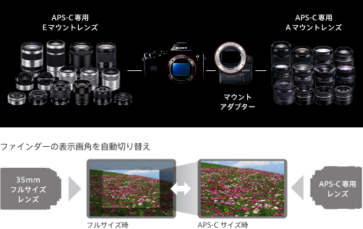 α7では、これまでのAPS-Cフォーマット専用のEマウントレンズもそのまま使用できます。また、マウントアダプターを使用すればAPS-Cフォーマット専用のAマウントレンズも使用でき、αレンズの豊富なラインアップを生かすことができます。APS-Cフォーマット専用レンズ装着時は、自動でAPS-Cサイズでのクロップ撮影になります(記録画素数は約1,000万画素)。その際、ファインダーも自動でAPS-Cサイズの画像を全画面表示します。