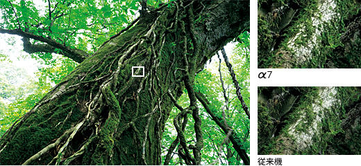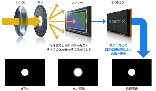 センサーの多画素化にともない、深い被写界深度で撮影する風景撮影などで課題となるのが回折現象です。画素サイズが小さくなるほど、また絞りを絞るほど顕著に表れるこの症状に対して、α7は回折低減処理を搭載。絞り値に応じたフィルタ処理を適用することで、パンフォーカス撮影においても高い解像感を実現しています。