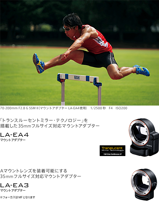 35mmフルサイズセンサー対応のマウントアダプターLA-EA4(別売)やLA-EA3(別売)を使えば、すべてのAマウントレンズ(*)をα7で使用できます。さらにLA-EA4なら、「トランスルーセントミラー・テクノロジー」搭載により、静止画・動画を問わず高速・高精度なTTL位相差検出方式AFが働くため、決定的な瞬間を逃さず捉えます。広角から望遠、単焦点レンズまで豊富なラインアップのAマウントレンズで、表現の幅がさらに広がります。