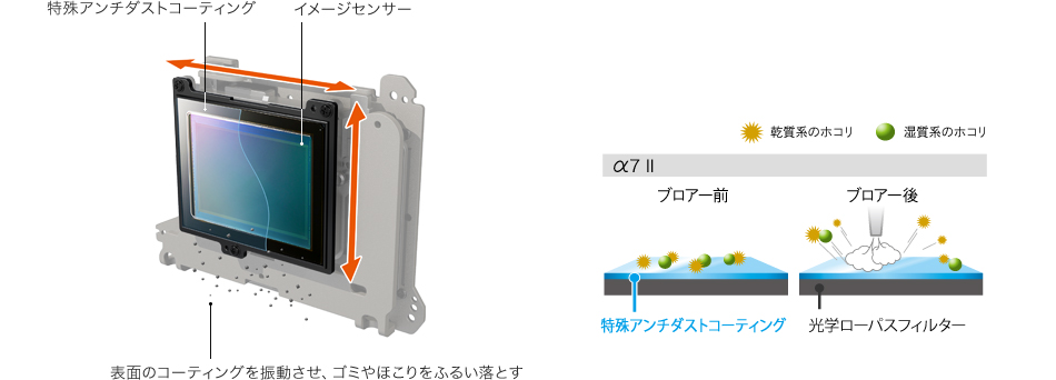 CMOSセンサー表面に特殊コーティングを採用。使用環境での温度や湿度などの変化で除去が難しくなるゴミやほこりの付着を抑制し、除去効果を高めます。また、クリーニングモード実行時に自動でセンサーを振動させるアンチダスト駆動により、センサーにゴミやほこりをつきにくくしています。