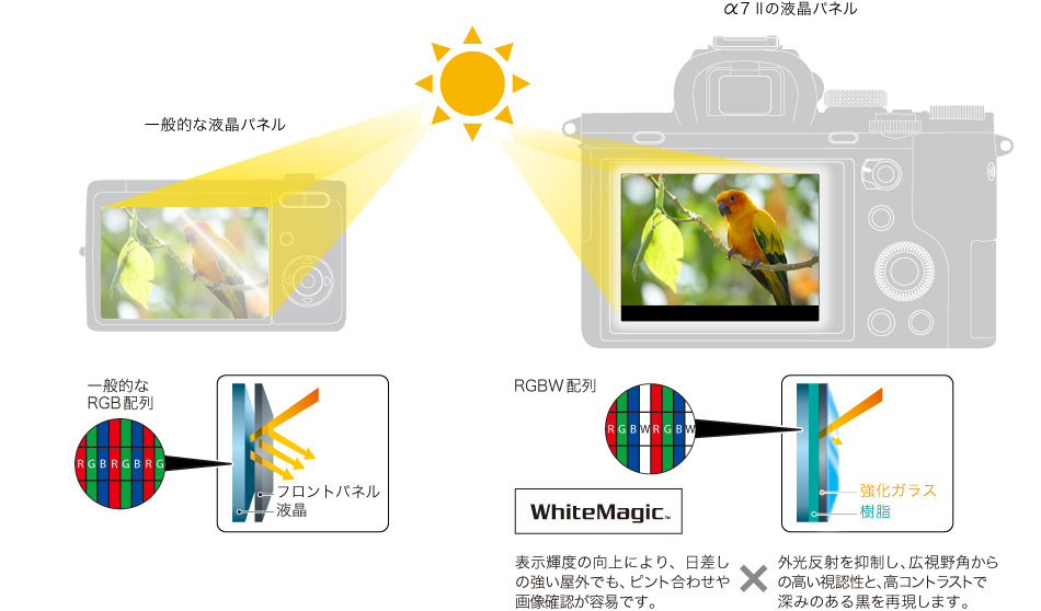 約122.9万ドットの大画面3.0型「WhiteMagicディスプレイ」を採用。画素に白画素を追加し画面をより明るくするWhiteMagic技術により、輝度を高め、屋外などの明るいシーンでも高い視認性を実現しています。さらに、晴天の屋外でも液晶画面が見やすい「屋外晴天」モードも搭載しています。