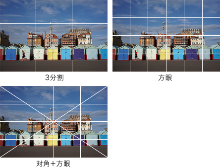 液晶画面にグリッドラインを表示できるので、水平や垂直の傾きを補正しながら、緻(ち)密なフレーミングが可能です。グリッドラインの表示は「3分割」「方眼」「対角+方眼」の3種類から選べます。