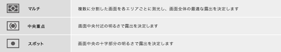 CMOSセンサーがとらえた画像を1200分割し、被写体の色や光の状況を細かく分析して高精度な測光を行います。測光モードは、各エリアの測光データをもとに適正露出を算出し、失敗の少ない露出制御を行える「マルチ測光」。知識や経験が生かせる「中央重点測光」、狙った部分だけを測光する「スポット測光」から、被写体やシーンに応じて選択できます。